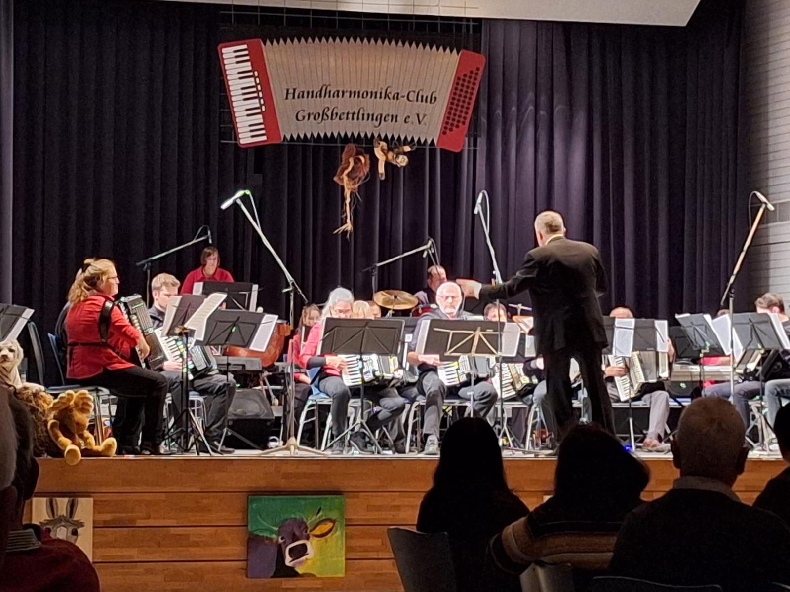Am Samstag, den 16.11., lud der HHC Großbettlingen zu seiner diesjährigen Herbstfeier ein, die ganz unter dem Motto „Tierisch Gut“ stand. Im mit allerlei tierischen Figuren geschmückten Forum der Generationen machte das Jugendorchester unter der Leitung von Robert Braininger mit „Can you feel the love tonight“ aus dem Film „König der Löwen“ den Anfang, bevor, nach der Begrüßung durch Vorstand Arved Frommberger, der Schwan aus dem „Karneval der Tiere“ folgte. Mit der „Biene Maja“ wurde die Titelmelodie aus der gleichnamigen Fernsehserie gespielt, bevor das Jugendorchester zusammen mit dem 1. Orchester das Lied aus der „Sendung mit der Maus“ spielte. Mit diesem Stück verabschiedete sich die Jugend von der Bühne und das 1. Orchester begab sich mit „Die diebische Elster“ aus der gleichnamigen Rossini-Oper und zwei Sätzen aus dem „Schwanensee“ in die Vogelwelt. Den Abschluss vor der Pause bildete dann „Das Dschungelbuch“, aus dem viele bekannte Melodien wie „Probiers mal mit Gemütlichkeit“, „Colonel Hathi’s Marsch“ und „Ich wär‘ so gern wie du“ gespielt wurden. In der Pause wurden die Zuschauer dann mit der Auslosung der Tombola-Gewinne unterhalten, so konnte man dieses Jahr unter anderem ein Spanferkel, eine Kaffeemaschine, Tickets für die Wilhelma oder für das Konzert von Sašo Avsenik am 28.3.2026 gewinnen. Den zweiten Teil eröffnete das 1. Orchester mit der Filmmelodie zu „Der mit dem Wolf tanzt“, bevor mit „Memory“ aus dem Musical „Cats“ einer der HHC-Ohrwürmer gespielt wurde. Nach „La Pulce d’Acqua“ – dem Wasserfloh – von Angelo Branduardi und dem Jazzklassiker „Tiger Rag“ ging das Programm langsam dem Ende zu. Vorher wartete aber noch ein Highlight auf die Zuschauer. So wurde zusammen mit der Saxophonistin Andrea Beckmann der „Pink Panther“ nach Großbettlingen geholt. Alle Beteiligten gaben nochmal alles und wurden vom Publikum mit großem Applaus belohnt. Nach dem anschließenden Dankeschön an den Musikverein Aich für die Hilfe in der Küche, an die Gastspieler und an unseren Dirigenten Robert Braininger wurde auch der Wunsch nach einer Zugabe mit dem „Crocodile Rock“ erfüllt, jedoch gab sich das Publikum auch damit noch nicht zufrieden und so wurden die Zuschauer nochmal mit „Pink Panther“ in den Abend verabschiedet!